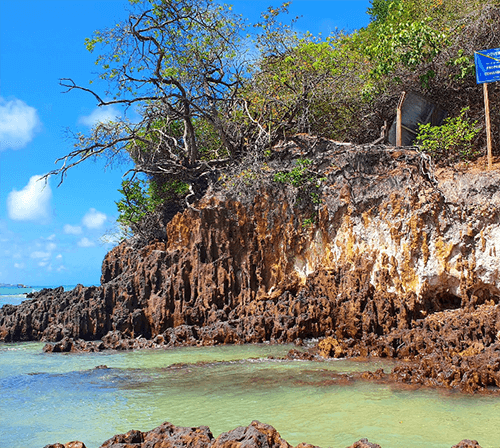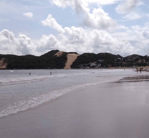 A água em primeiro plano cria reflexos interessantes, especialmente nas primeiras horas da manhã ou no final da tarde, quando a luz é mais suave. Essa composição transmite a sensação de imersão na paisagem e revela a harmonia entre o morro, o mar e a orla de Ponta Negra.